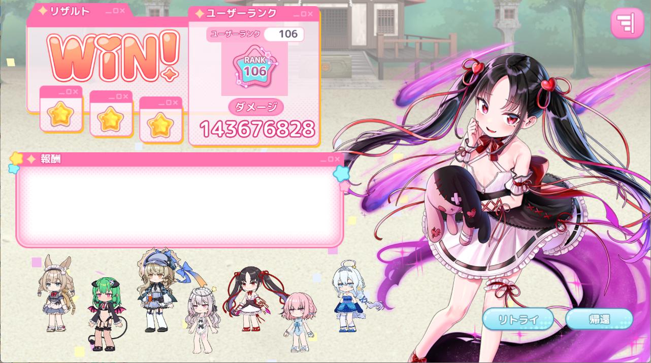 | … | 1526/01/19(月)18:57:06No.1394033928+今回のアタッカーのおめかしルミナさまみたいに元々一番前狙いのキャラなら実質ノーリスクぷに |