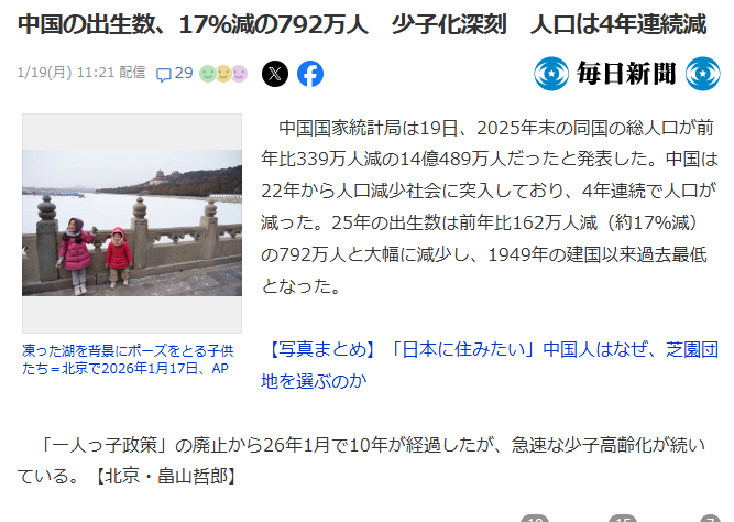 | … | 5526/01/19(月)21:38:10No.1394097730+10年位前までは中国は出生率1.8あったのに今は1.0を切ってるからな… |