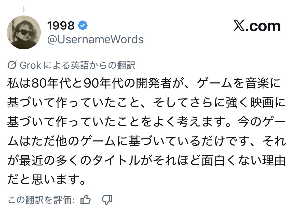 | … | 8126/01/21(水)15:59:20No.1394560491そうだねx3>単に昔は今ほど情報共有が出来てなくて海外の映画から話まんまパクったりゲーマーと全然畑違いの分野からネタ引っ張ってきたりしてもバレなかったから新鮮だったってだけじゃね |