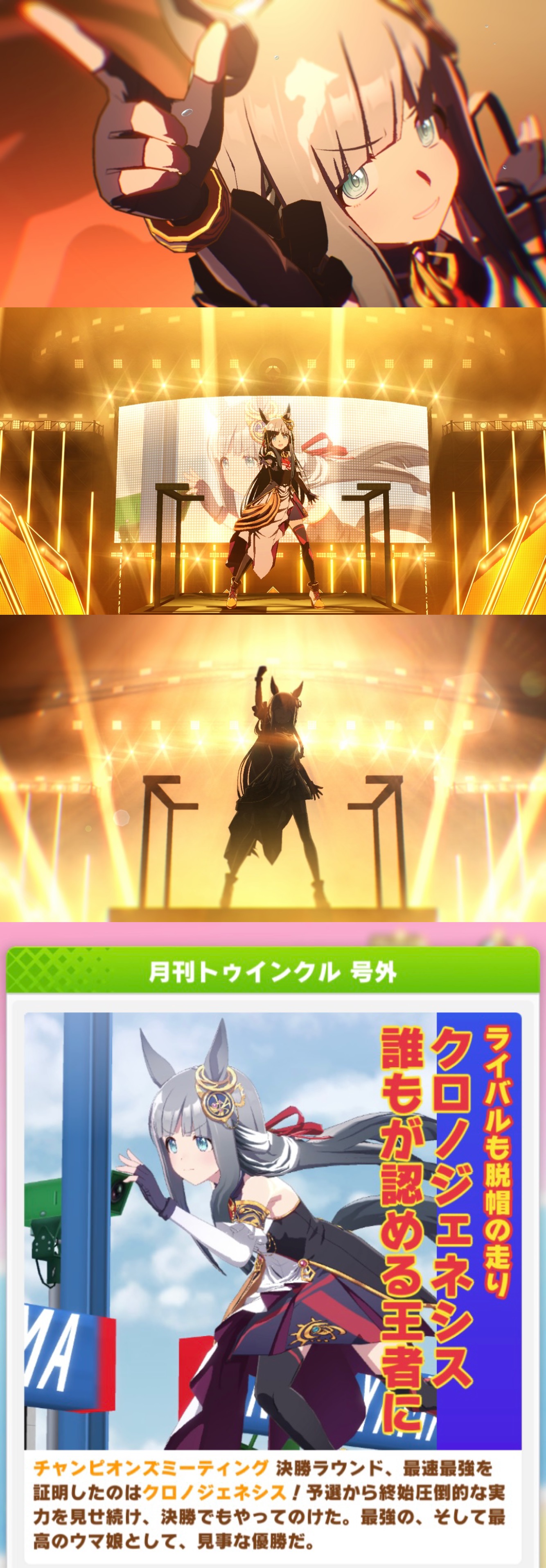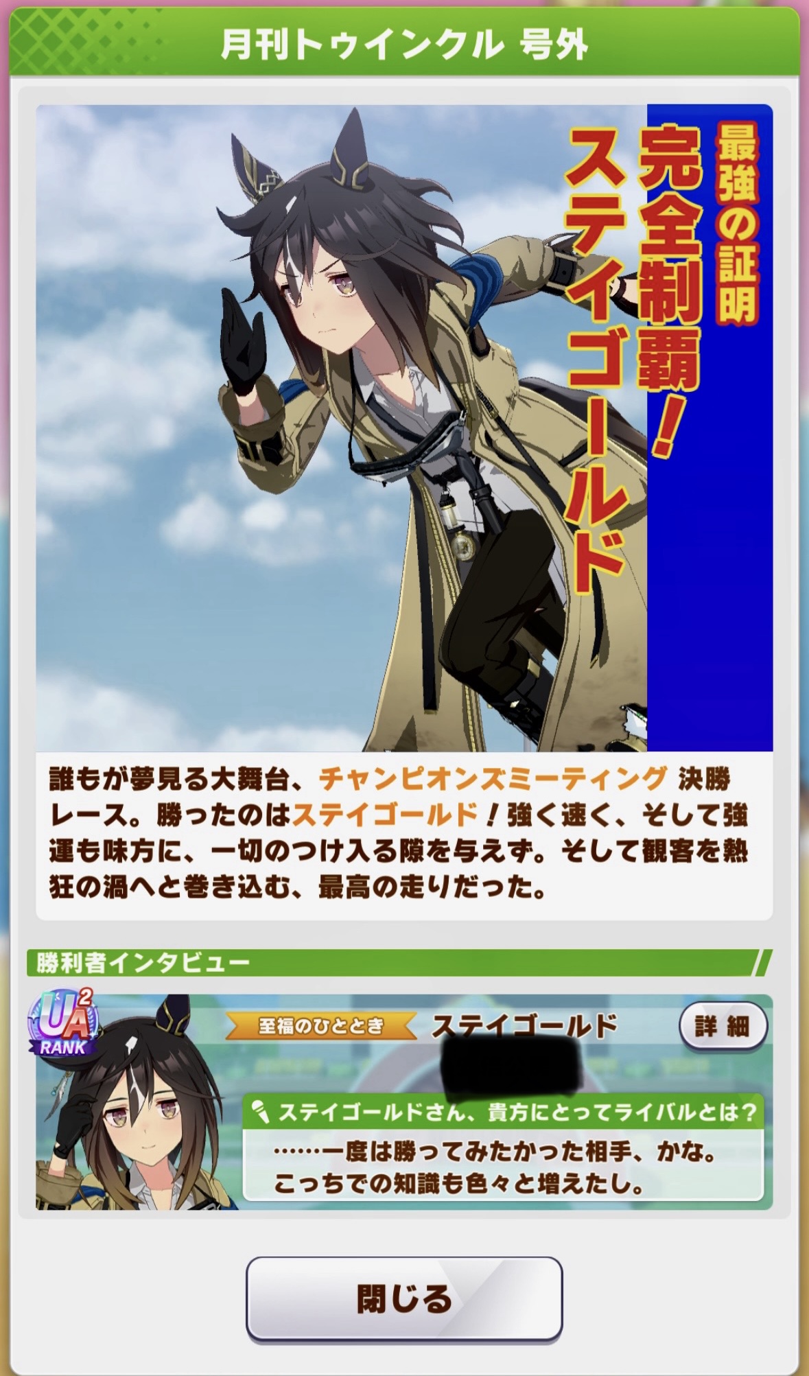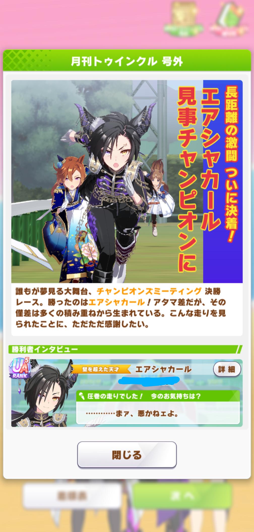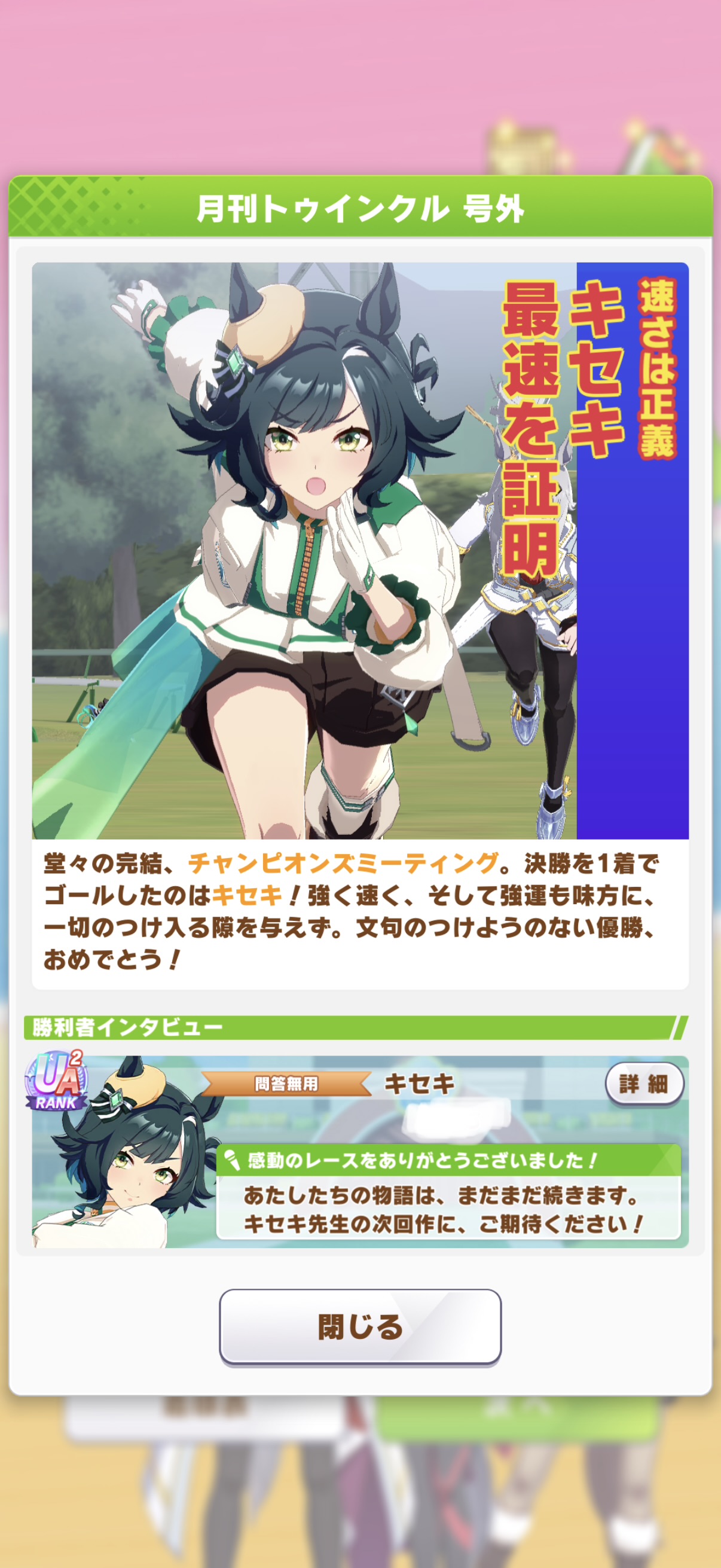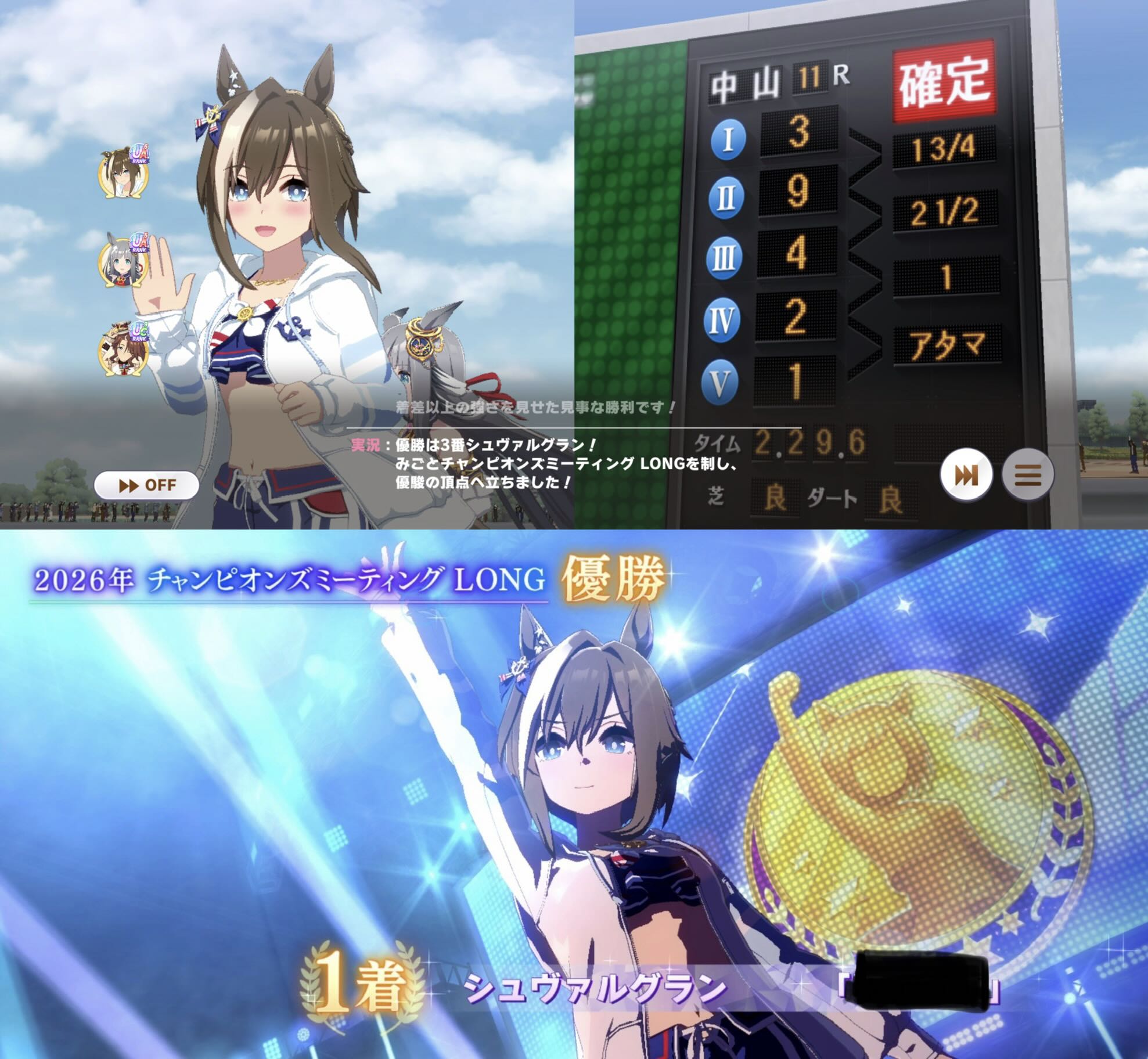 | … | 36326/01/27(火)12:43:02 ID:.rSJssUwNo.1396320666+>>ってか赤キタちゃんの固有で主題歌流れるんですねいつも飛ばすので初めて知りました >👀クスン >💧 でも3位ですよ3位!ネイチャさんと一緒です |