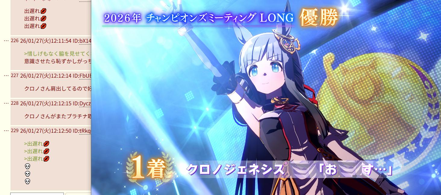 | … | 31726/01/27(火)12:31:53 ID:axGyiTowNo.1396317320+浦和コラボのクロノちゃんはそれでいいんですか...? |