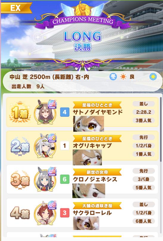 | … | 7126/01/27(火)23:51:22 ID:n8U0INA6No.1396511610そうだねx4チャンミ勝ってました! 前回のマイルに引き続いて連続センターです! fu6222309.jpg |