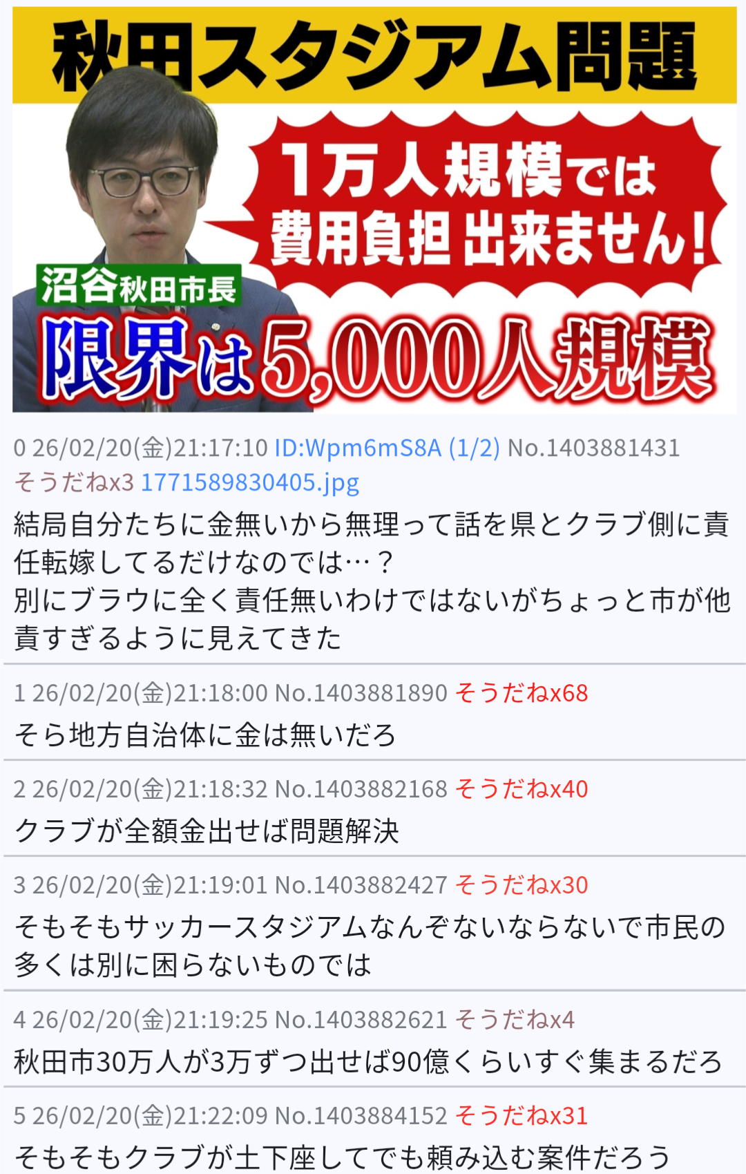 | … | 3426/02/20(金)22:50:13 ID:TDUIbh1wNo.1403922357そうだねx1やっぱり秋田市スレを消したのもこの玉蹴り信者の仕業か |