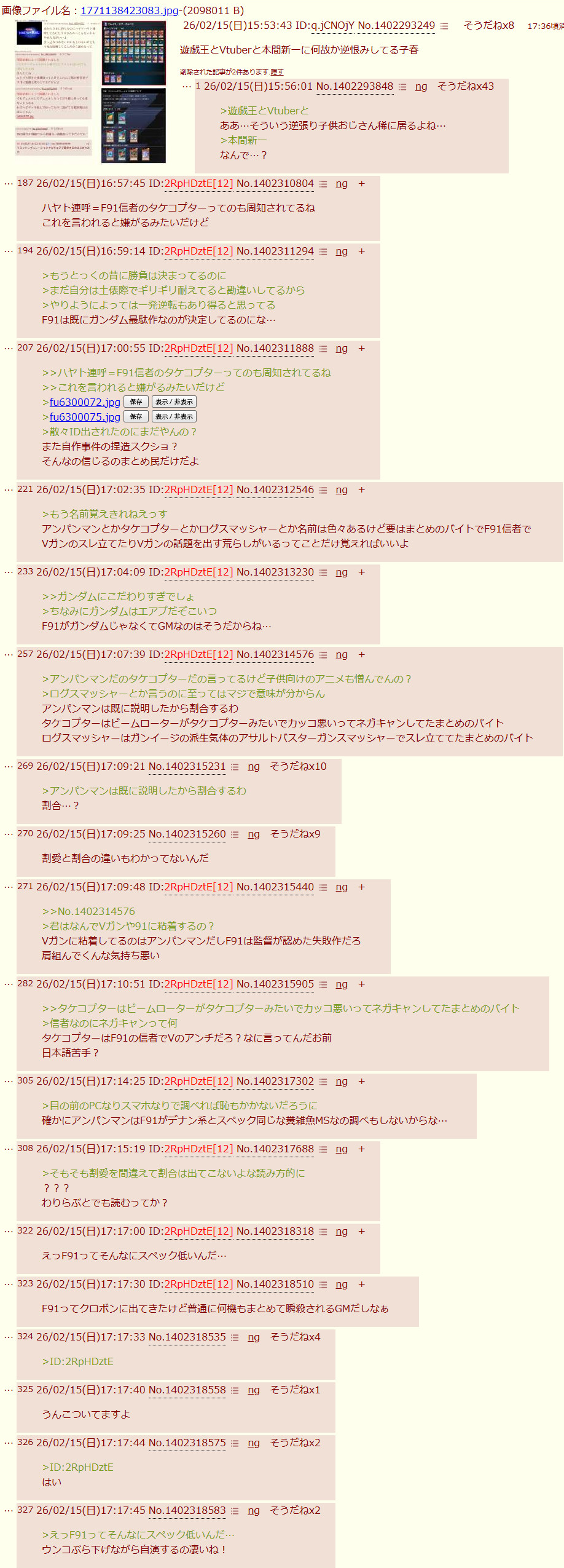 | … | 29726/02/22(日)14:00:44No.1404418575+F91がどうのこうのと連呼してるレスはうんこが出ないままキッチリ消えてるから複数回線でやってるのが分かる |