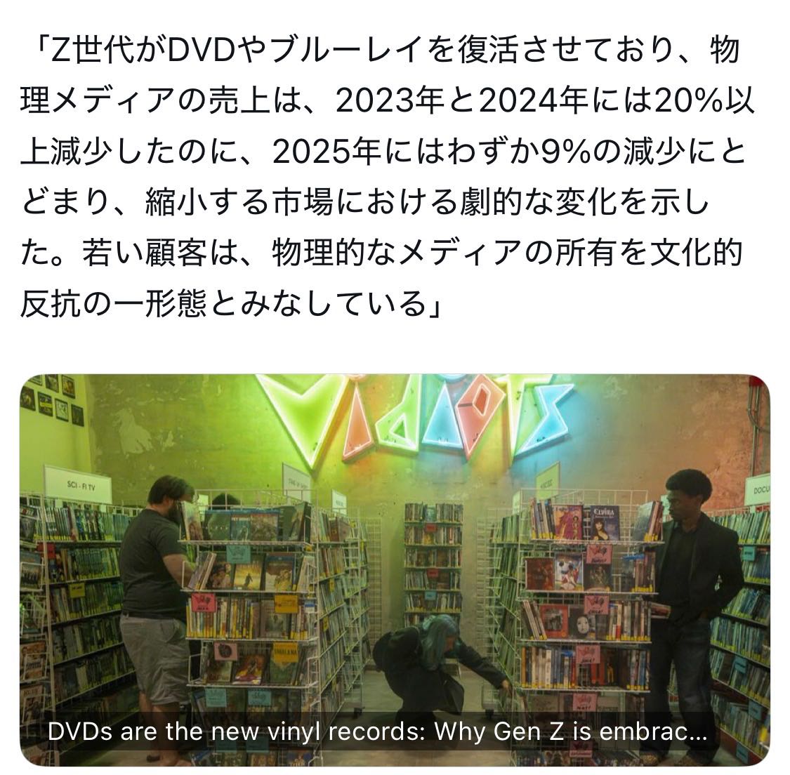 | … | 8426/02/26(木)00:06:09No.1405605422そうだねx2要するにサブスクのラインナップが企業の気分でついたり停めたりされるから企業の制御できない物理メディアの所有が文化的反抗になるということ? |