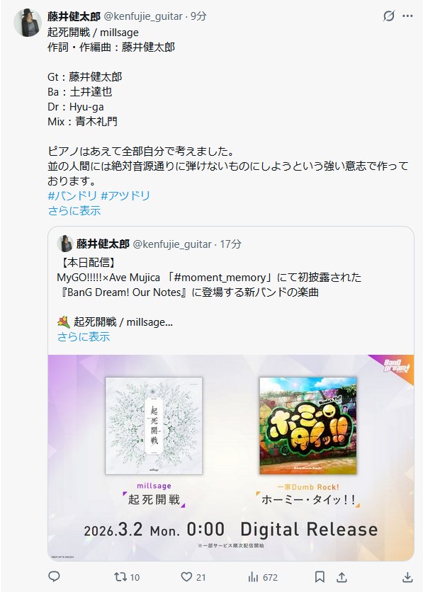 | … | 6226/03/02(月)00:41:12No.1406902623+>リアバンやるつもりならいきなり複雑な曲にするわけないとは思いますが |