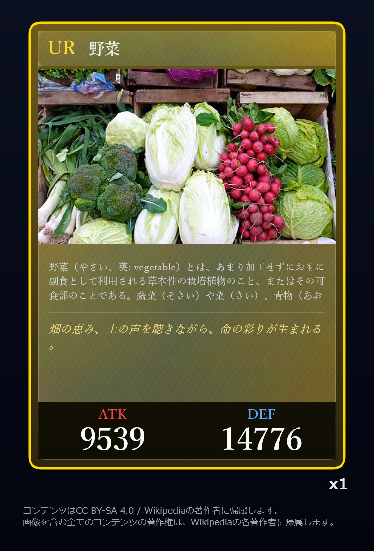 | … | 4326/03/04(水)14:42:04No.1407611695+>俺はバナナとニンジン(SR)とサツマイモ(UR)を引いたけど貴様は? |