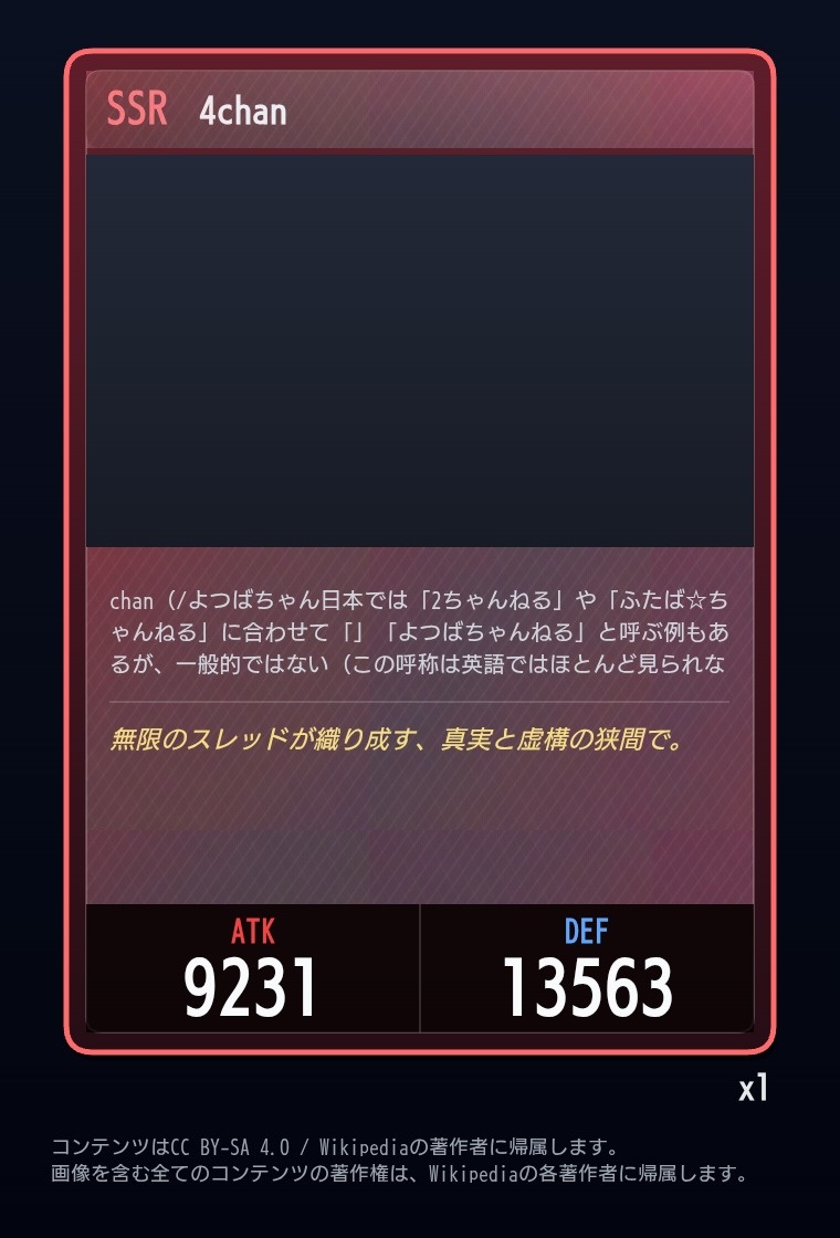 | … | 5526/03/04(水)14:47:48No.1407612822+パックが開かないカードゲームになってもうた |