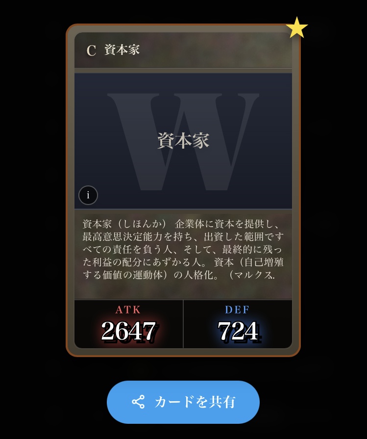 | … | 5126/03/05(木)02:48:06No.1407805129そうだねx2>マルクス批判余裕じゃん!と思ったけど戦う度にこっちのカードがカスになっていくからマルクスの残りHPが減るにつれてこっちの与ダメージも減っていくからアキレスと亀みたいになってる… |