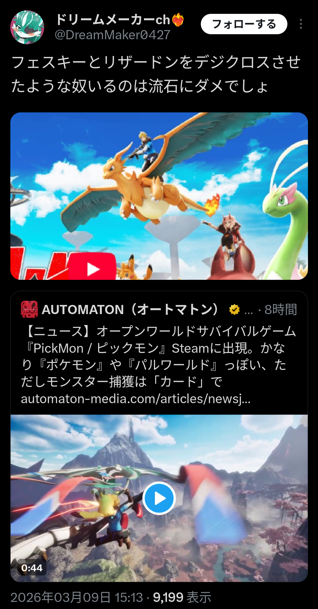 | … | 16026/03/09(月)21:26:36No.1409237687そうだねx1>これは任天堂に訴えられてないからパルワよりクリーンだけど何言ってるの? |