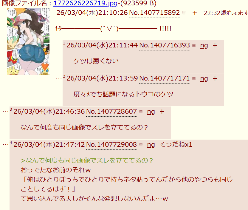 | … | 21726/03/10(火)02:42:15No.1409328925そうだねx2今回の3回目以降のケツスレは荒らしだよ |