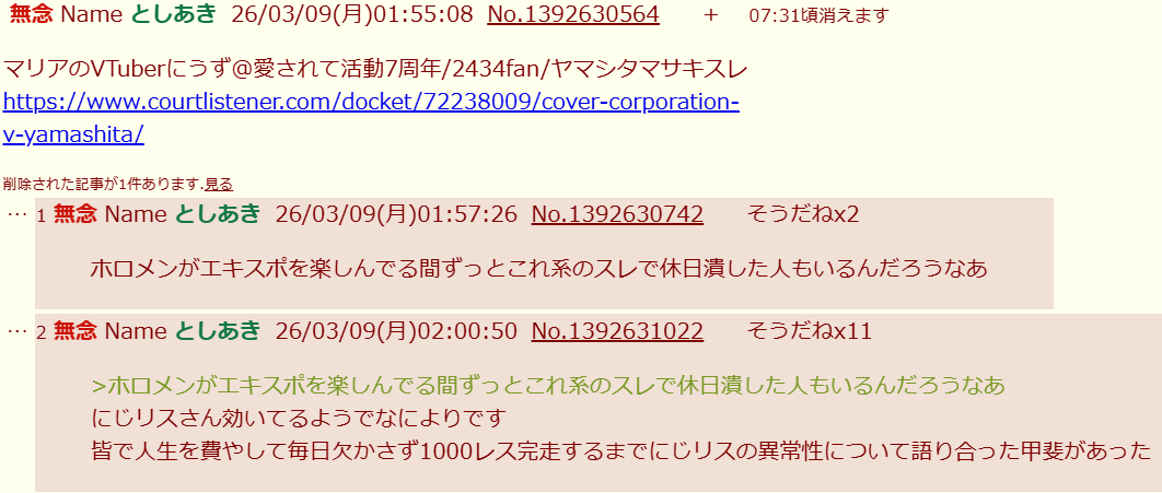 | … | 826/03/10(火)12:42:29No.1409390341そうだねx1>ホロライブに粘着して8年目のヤマシタマサキくんの話? |