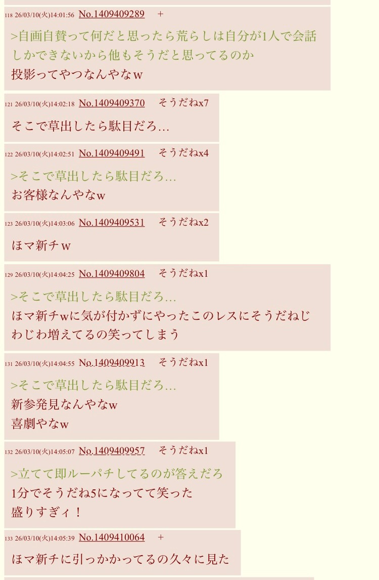 | … | 22026/03/11(水)07:19:58No.1409621596+>念はたまに自演して自分のレスに同意してくるタイプの荒らしが超念!〇〇だよね!とか言い出す以外に全く見なくなった |