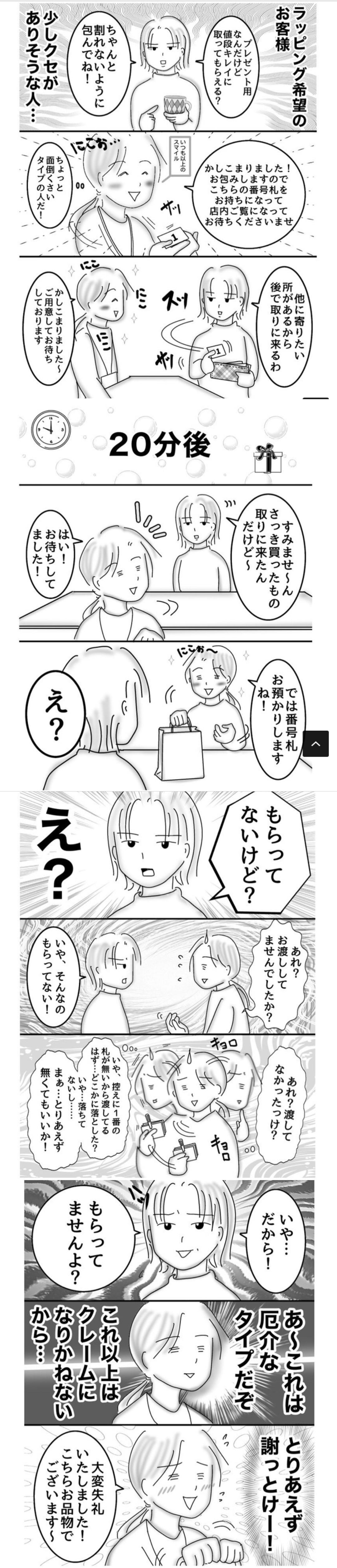 | … | 1426/03/11(水)22:05:45No.1409845283+>スレ画の続きみたら番号札うっかり財布の中にしまってたらしくちゃんと謝罪して返してた |