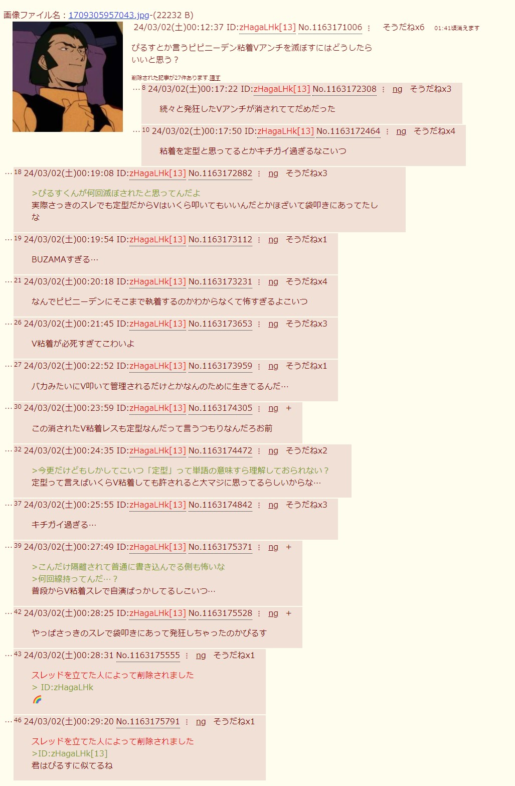| … | 7026/03/13(金)03:35:36No.1410215595+>スレ画のアホはVガンダム粘着コピペをする荒らしでありVtuber粘着と遊戯王粘着をする荒らしでもある事が判明してるから |