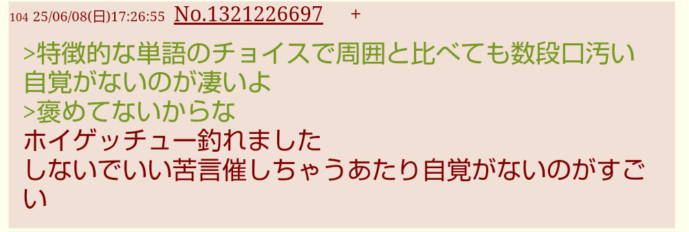 | … | 15126/03/13(金)21:10:48No.1410415462+自演下手くそなことさえ自己肯定始めたらあかんよ |