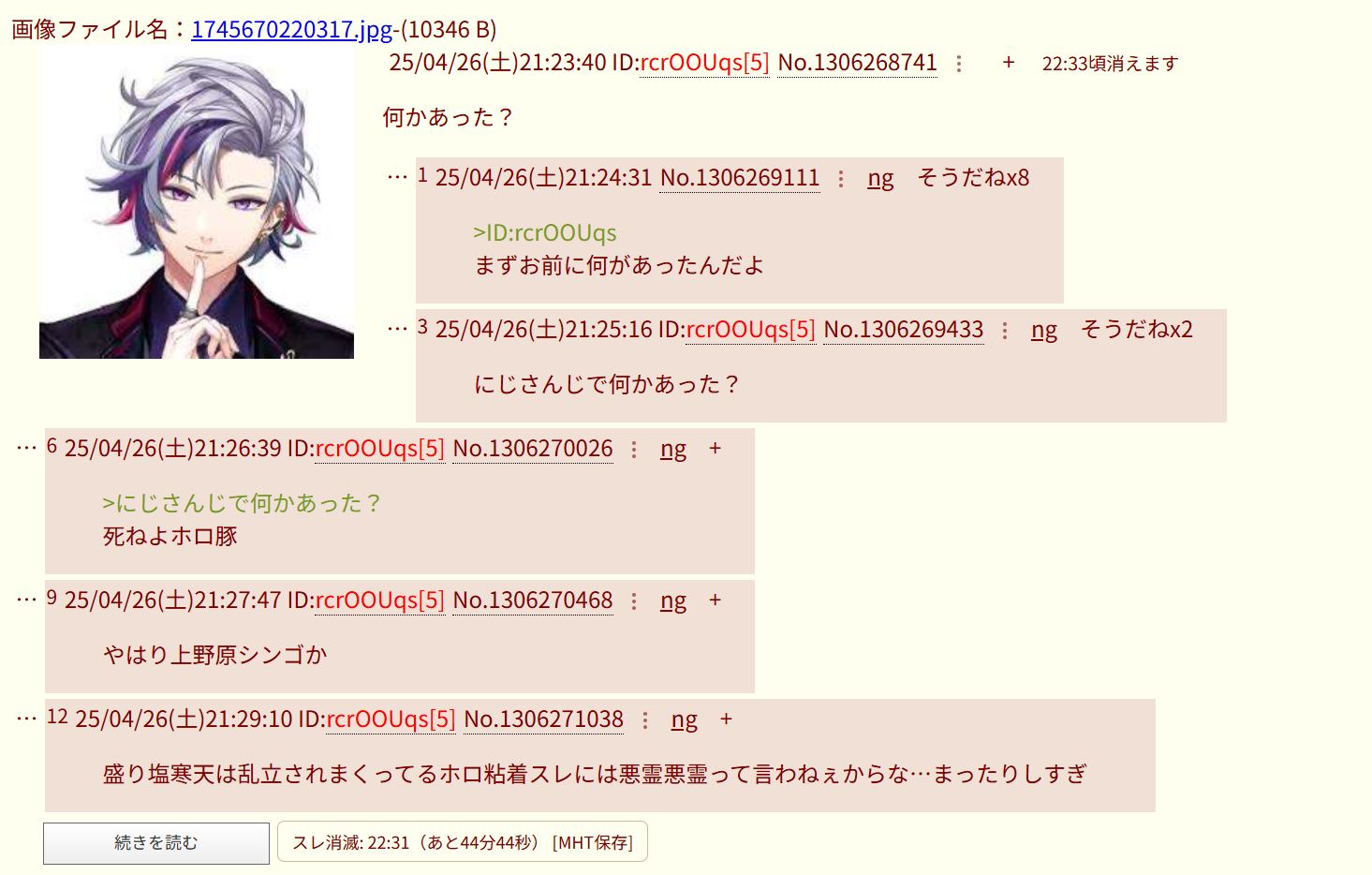 | … | 426/03/13(金)20:11:48No.1410392112そうだねx40>クソスレ立てんな早く死ねホロ豚ハヤト |
