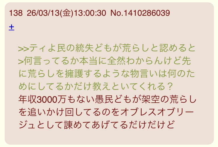 | … | 926/03/13(金)20:53:45No.1410408698+年収3000万ない愚民どもを煽るけど自分が年収3000マンとは言ってないから虚言にならないライフハック |