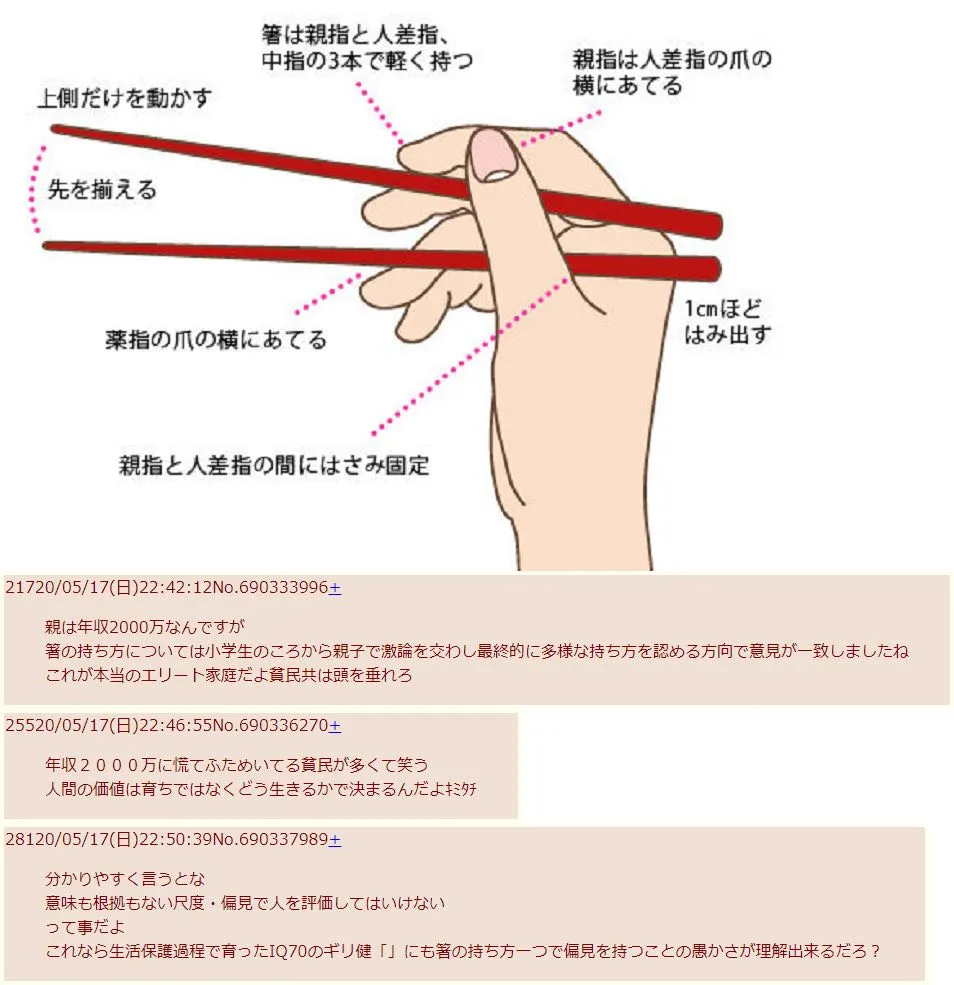 | … | 6126/03/13(金)21:19:35No.1410418936そうだねx1>なんか箸の持ち方おかしいって指摘されたら親が年収2000万の上流で云々とは別の障碍者? |