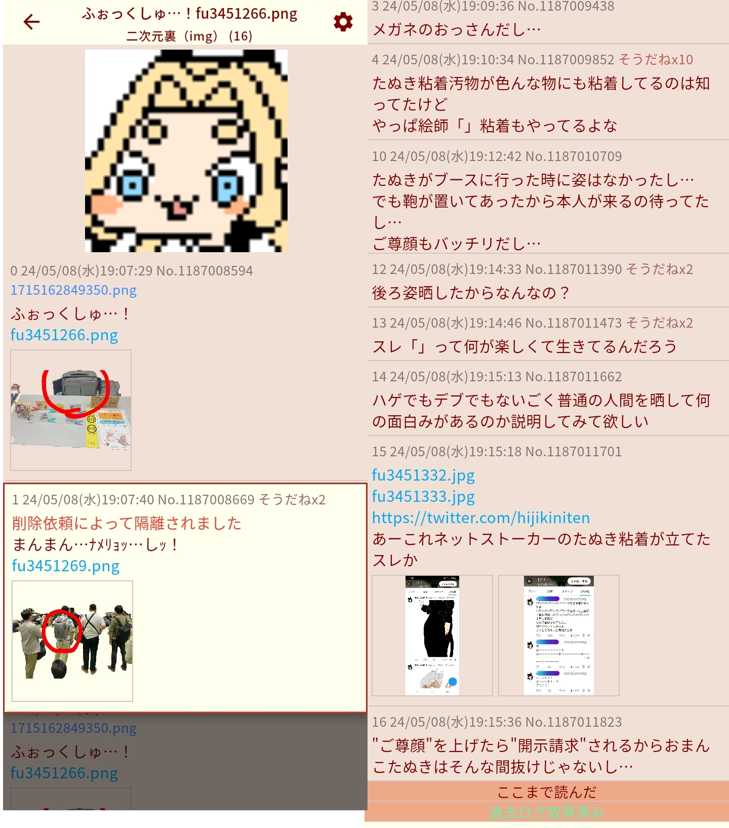 | … | 11526/03/13(金)21:29:46No.1410422827+>絵師粘着っつうか漫画家への粘着もプロより同人作家への憎悪がすごくて |