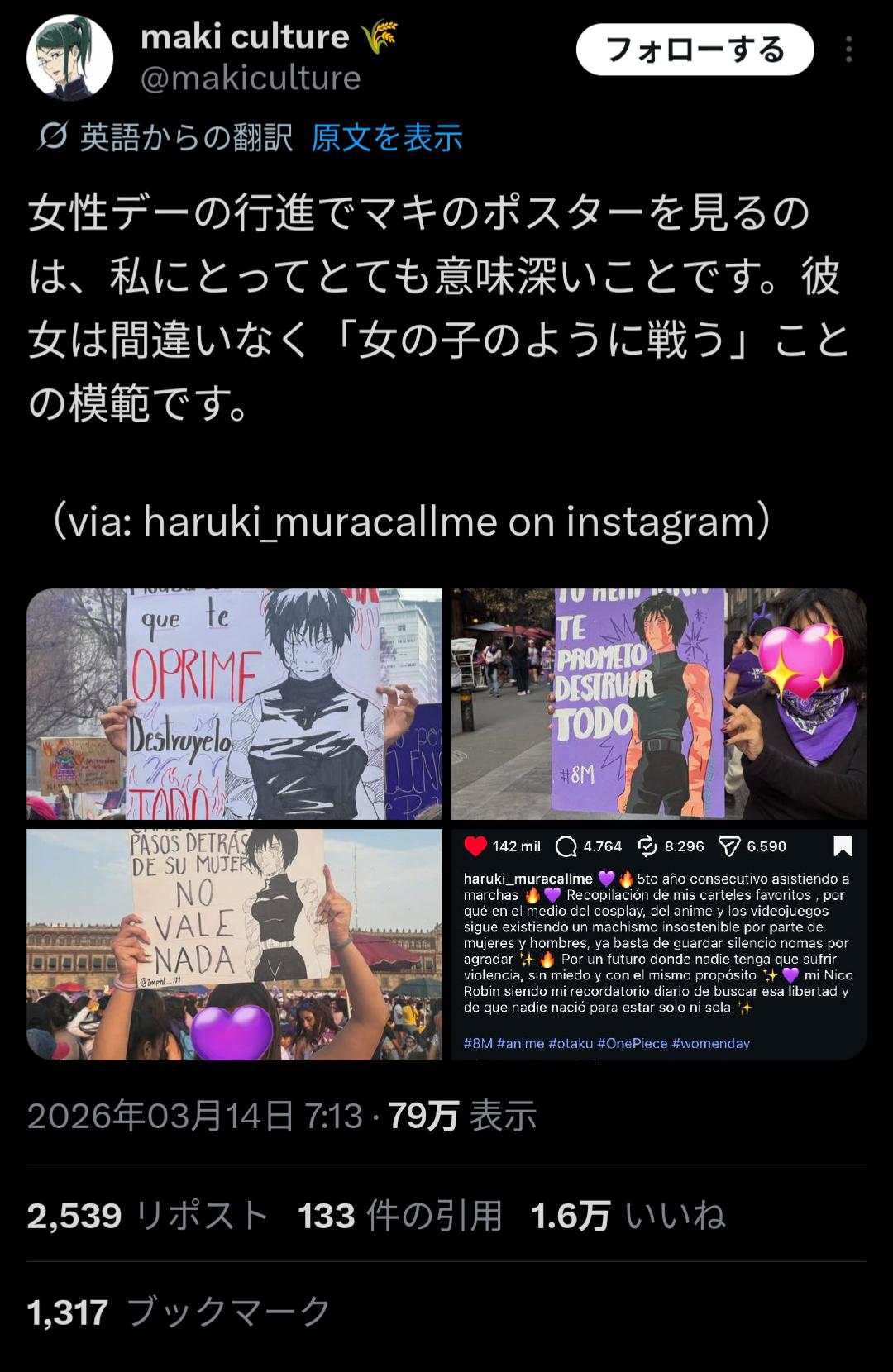 | … | 24226/03/15(日)09:46:39No.1410887886+ワンピースも麦わら海賊団の旗が世界で反権威のシンボルになりつつあるし作品のメッセージ性が強いほど今回の真希のような取り扱われ方になると思う |