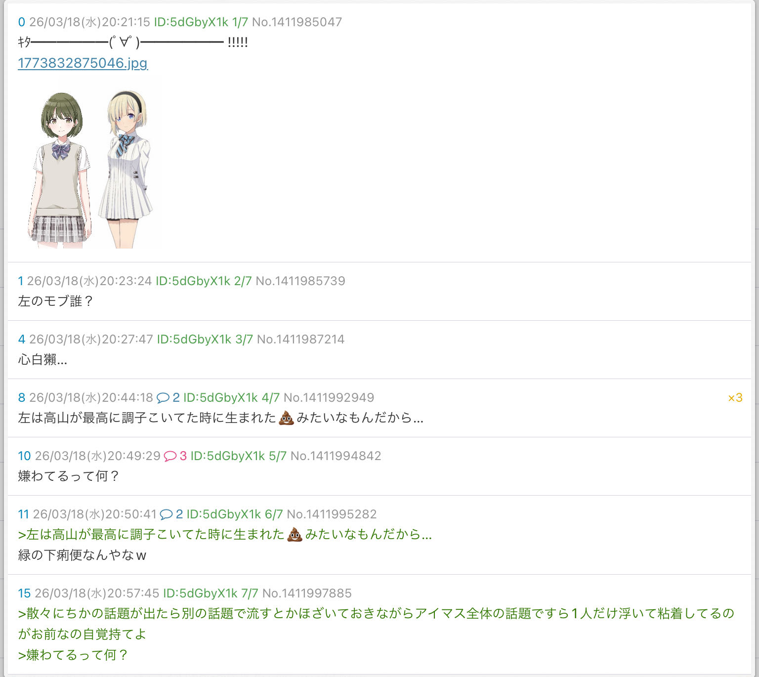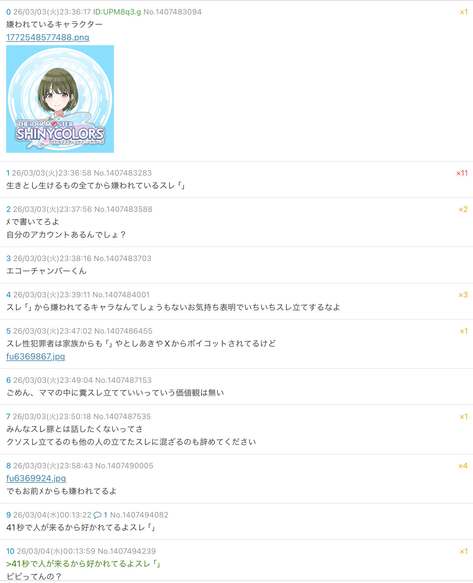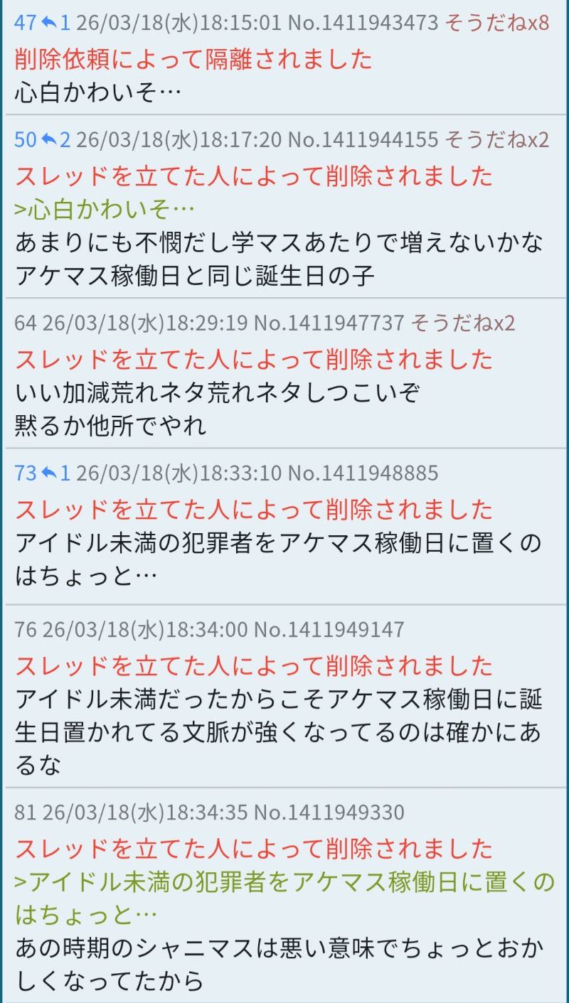 | … | 2626/03/19(木)16:35:29No.1412208979+del入れられてるのはにちかが嫌われてるからではなく粘着が嫌われてるから |