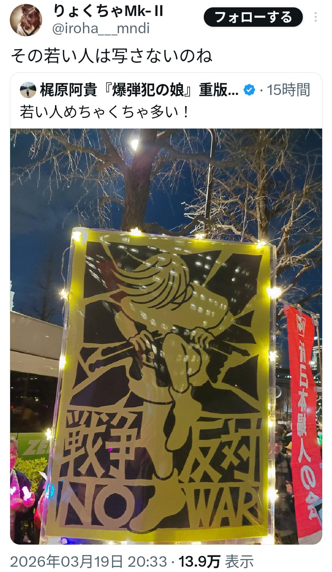 | … | 1126/03/20(金)12:25:58 ID:a4CngqNcNo.1412447268+戦争反対や今の政府へのデモを呼びかけるようなイラストや漫画ふえたね |