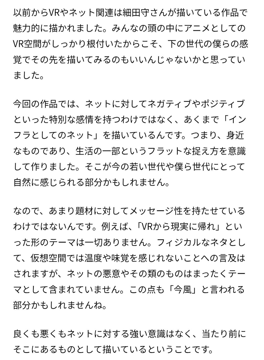 | … | 93126/04/12(日)00:51:46No.1419487222+だからこそ作れるものがあり、アニメNEEDYはSNS時代の墓標になる。おそらく、インターネットを題材にしてNEEDYの規模を越えた作品はそう簡単に誕生しない。ニコニコ〜SNS時代の空気感を、悲しみも楽しみも、すべてひっくるめて丸ごと表現できたと自負がある。倫理を越えた痛みも快楽も。おそらく、次に継ぐものが現れるのはSNS時代が終了し、次の世界が開け、そこで最も寂しかった者が作る。だから、SNS時代はNEEDYが背負ってしまうはずで。 |