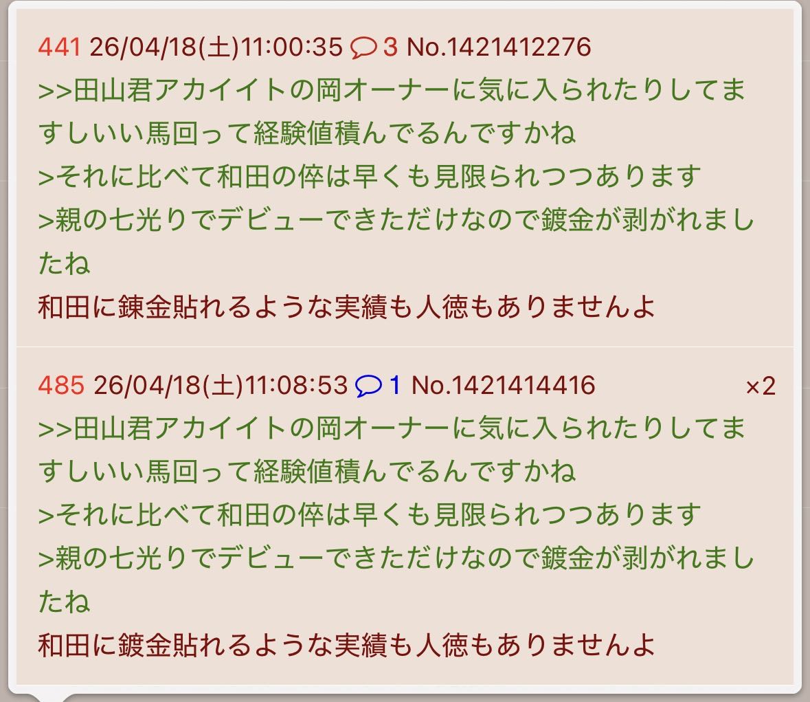 | … | 41826/04/18(土)10:52:17No.1421410237+田山君アカイイトの岡オーナーに気に入られたりしてますしいい馬回って経験値積んでるんですかね |