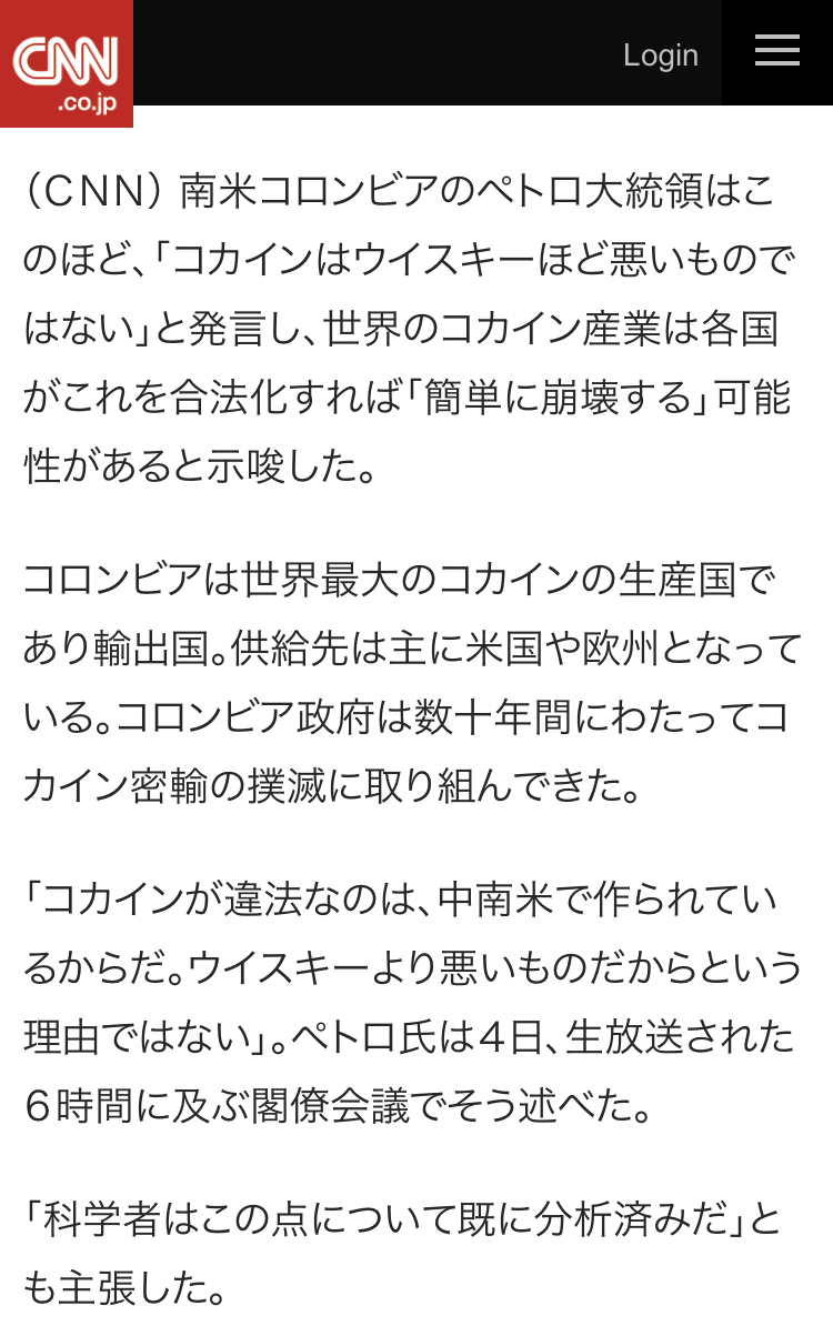 | … | 43無念Nameとしあき26/01/05(月)12:22:45No.1378074147+>コロンビアのペトロ大統領(元極左ゲリラ)はコカイン合法化を目指してるイカレポンチなので… |