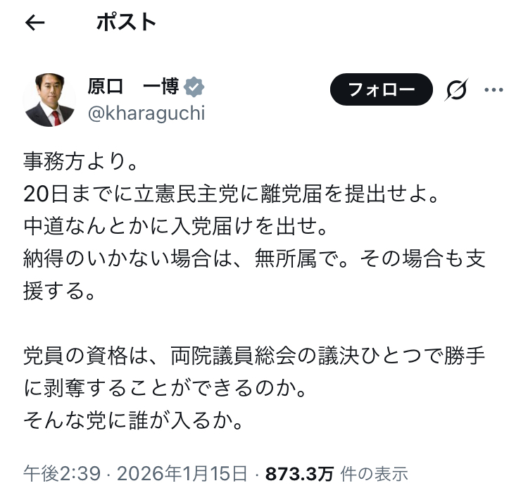 | … | 982無念Nameとしあき26/01/17(土)04:54:05No.1380668871そうだねx2立憲があっさり乗っ取られてて面白い |