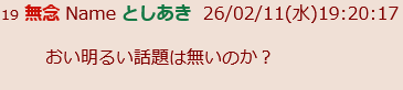 | … | 36無念Nameとしあき26/02/20(金)19:45:11 ID:4zWcOT0UNo.1388726545+おい明るい話題は無いのか? |