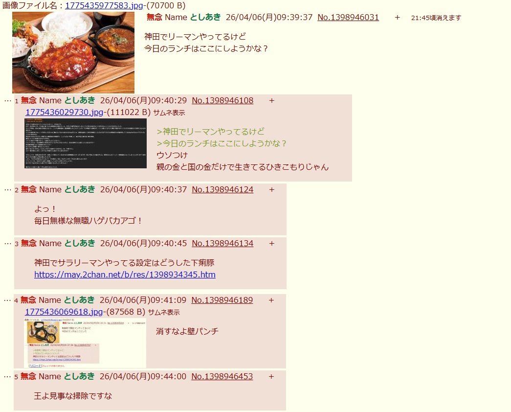| … | 14無念Nameとしあき26/04/06(月)09:58:07No.1398948028そうだねx3 1775437087676.jpg-(245784 B) ![]() >今日のランチはここにしようかな? |