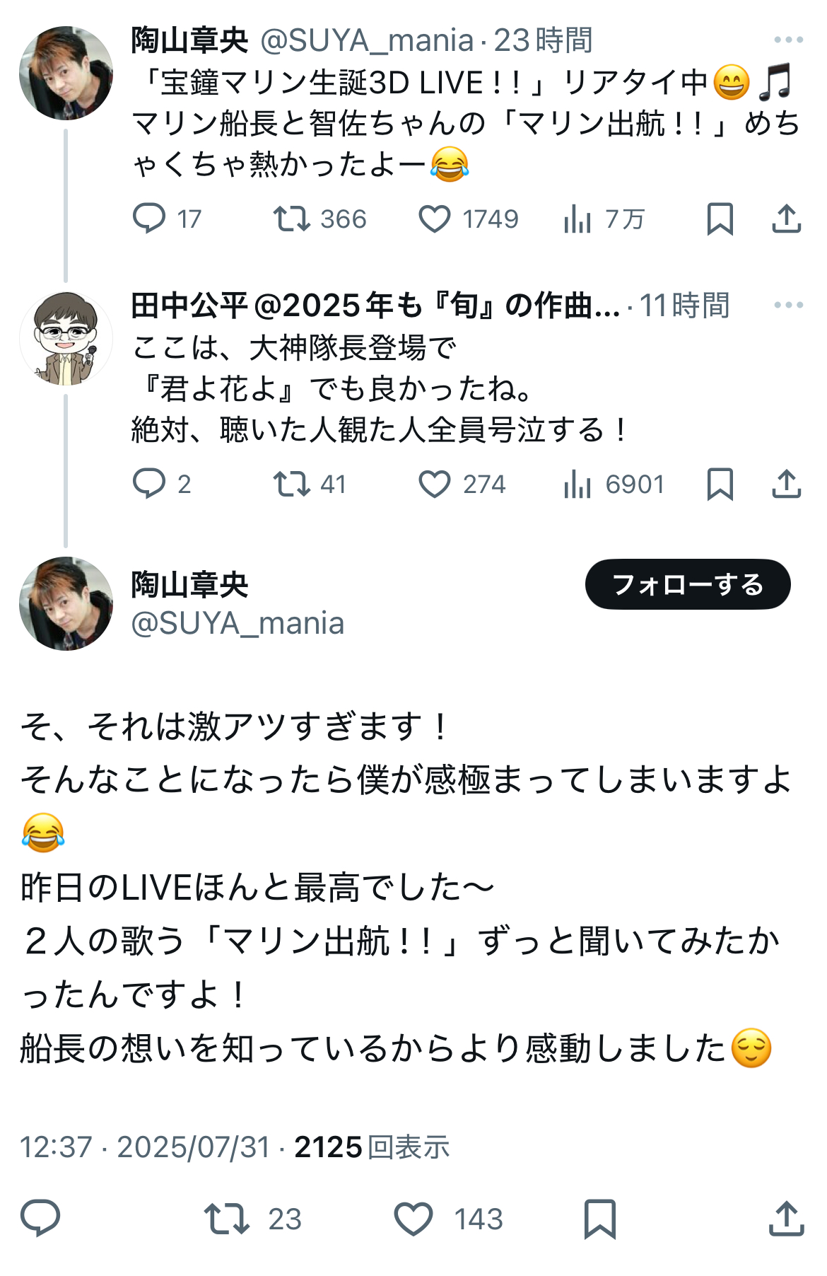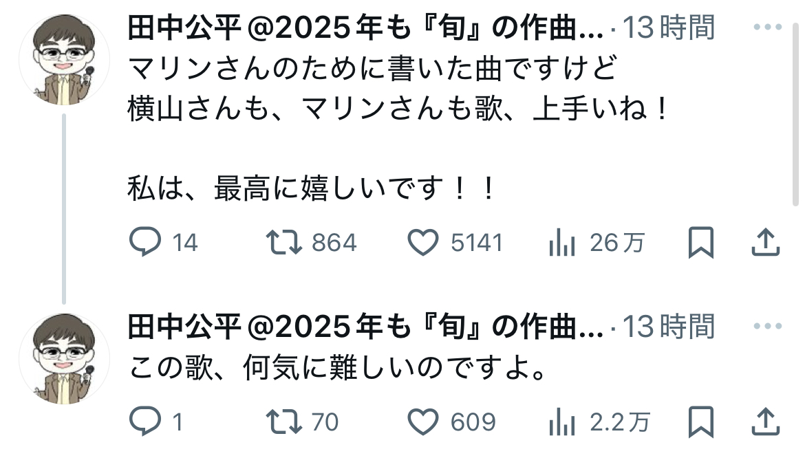 | … | 5225/08/01(金)14:11:38No.1338872611+後から話題になってたのを知ってちさタローと船長のデュエットに大満足した田中公平 |