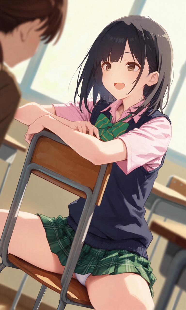 sitting,spread legs,school chair,backrest,Hugging backrest,