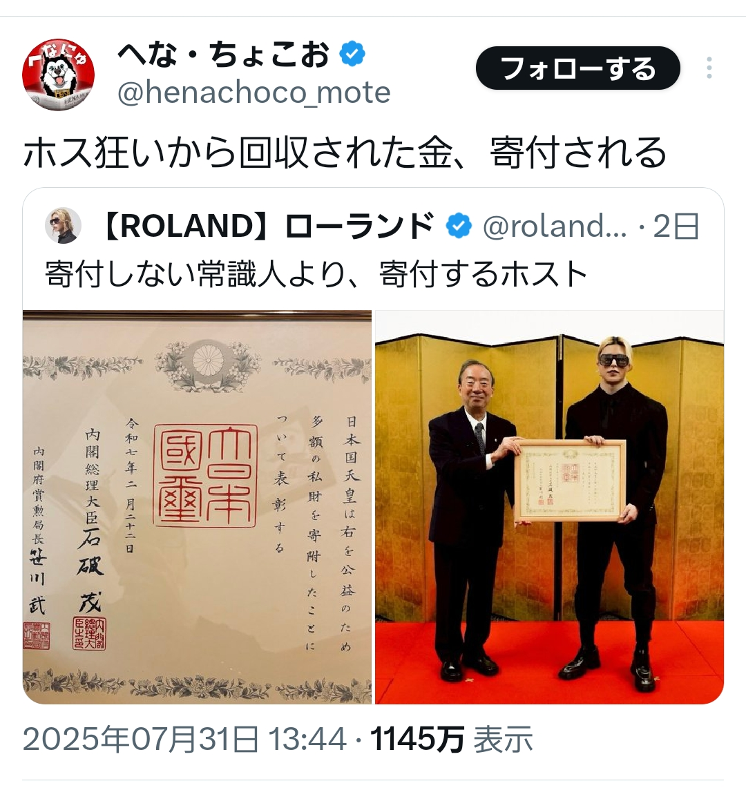 | … | 2225/08/02(土)10:02:42No.1339117902そうだねx4紺綬褒章だから500万円以上寄付してるなこれ |
