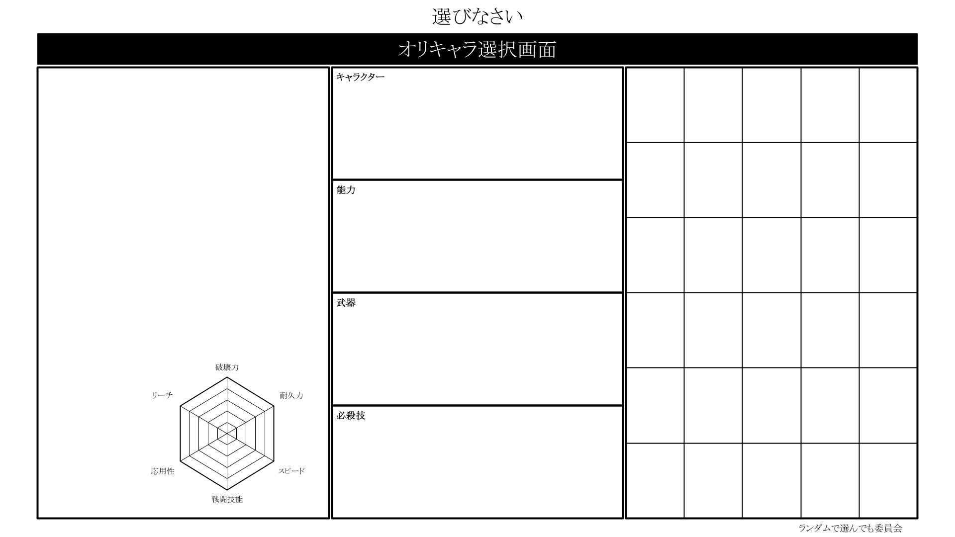 オリキャラでアクションゲーム空想するの良いよね…と思ったので選択画面っぽいものを描きました