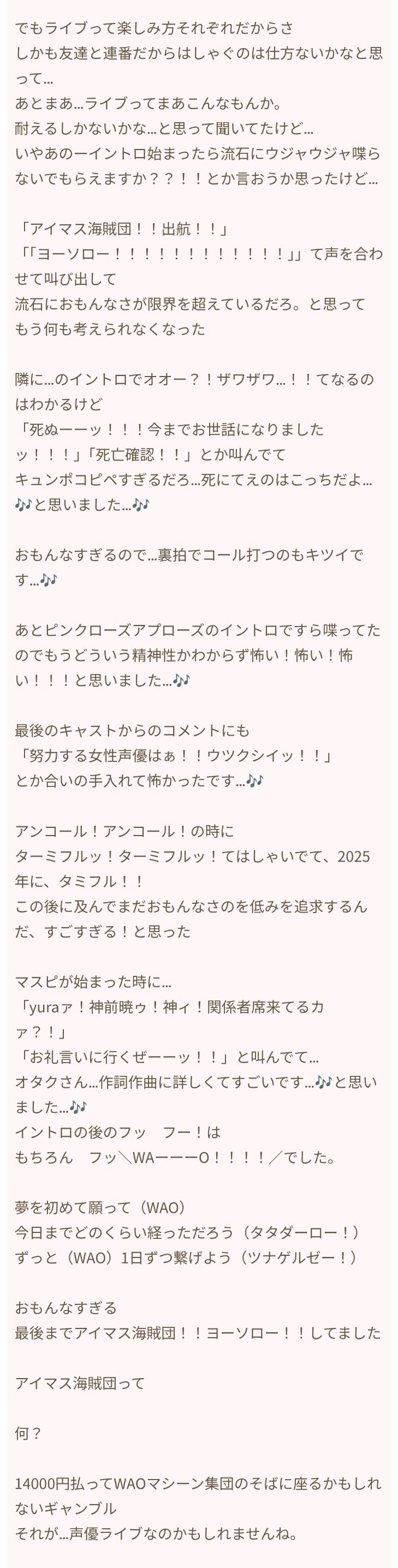 | … | 89225/08/03(日)14:29:00No.1339560036+ライブなんてこんなもんだからコンテンツ云々言う気はないしコールを作ってくれる人がいなかったらそれこそライブなんて寂しいものになるだけだけど |