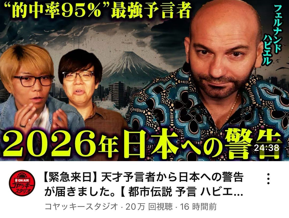 | … | 6025/08/04(月)17:04:43No.1339936198+元々予知って統計学で当たる時は当たるが怪しいのに最近のは商売な感じで統計すらしてなさそうだな信じたいものを信じるものだが良くも目が覚めないものだな |