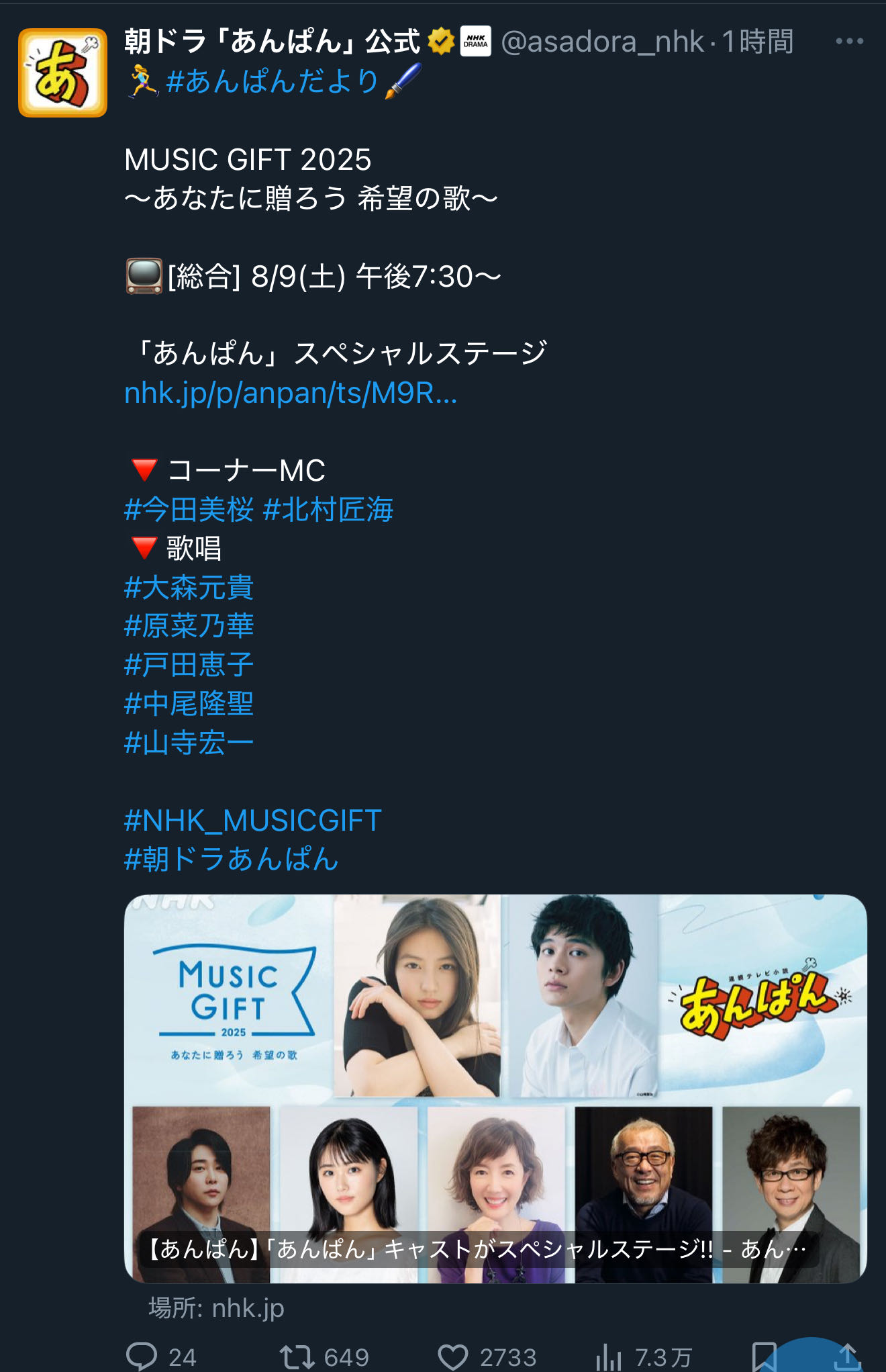 | … | 125/08/05(火)07:57:20No.1340141734+明日の放送は15分早い8月6日 (水) 午前7:45〜です |