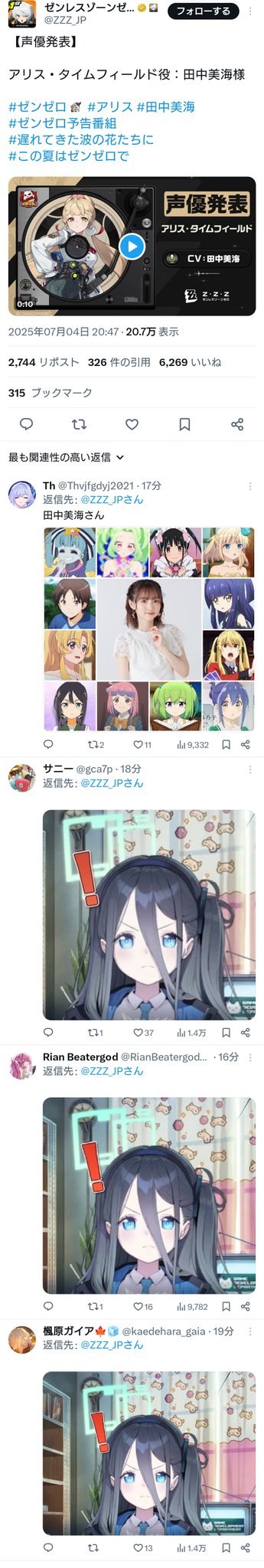 | … | 33425/08/05(火)14:07:22No.1340212125+>気になって調べたらcv田中美海のアリスなんか多いな |