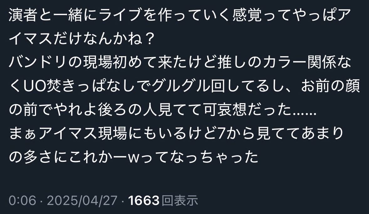 | … | 46025/08/05(火)18:44:22No.1340271998+>アイマス最高コールは普通にライブ中にやるよね |