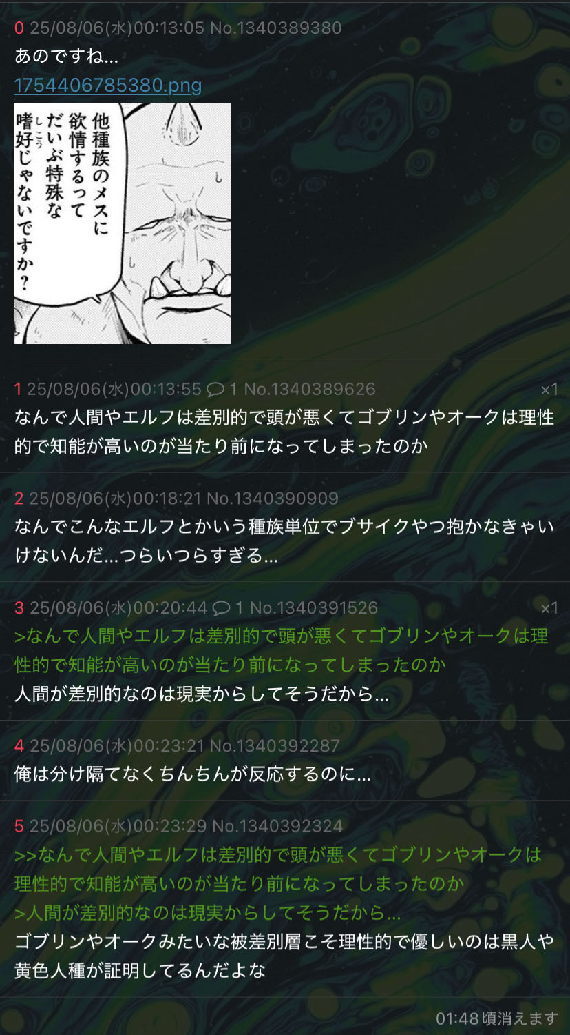 | … | 1125/08/06(水)00:38:42No.1340396744+なんで人間やエルフみたいな性欲しか頭にない低脳のくせに悪意だけは凄まじい生き物が我が物顔で歩いてるのだろう… |