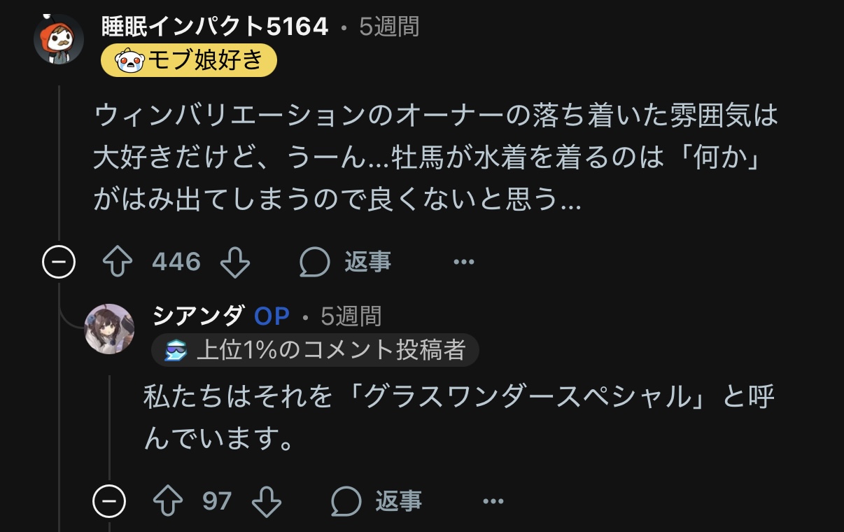 | … | 13125/08/07(木)16:25:26 ID:Dk0r1uZoNo.1340817016+温泉上がりでスベスベな担当ウマ娘を見れるトレーナー羨ましいです |
