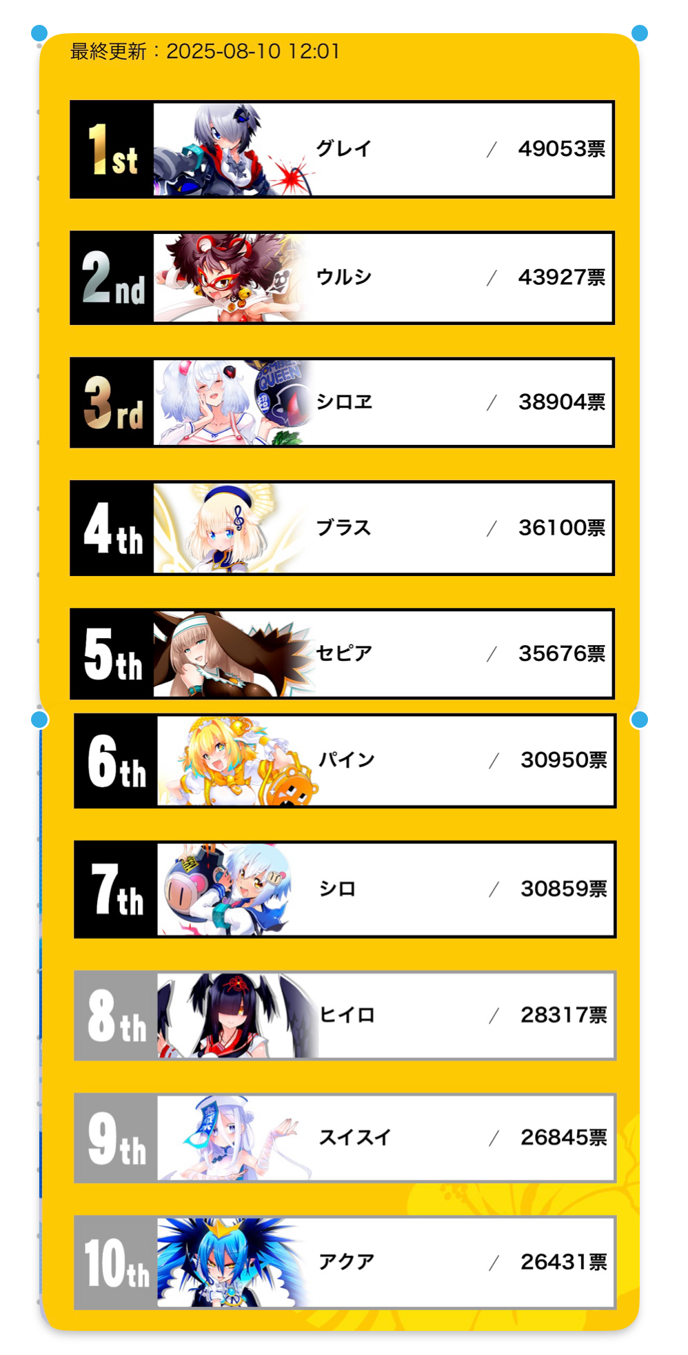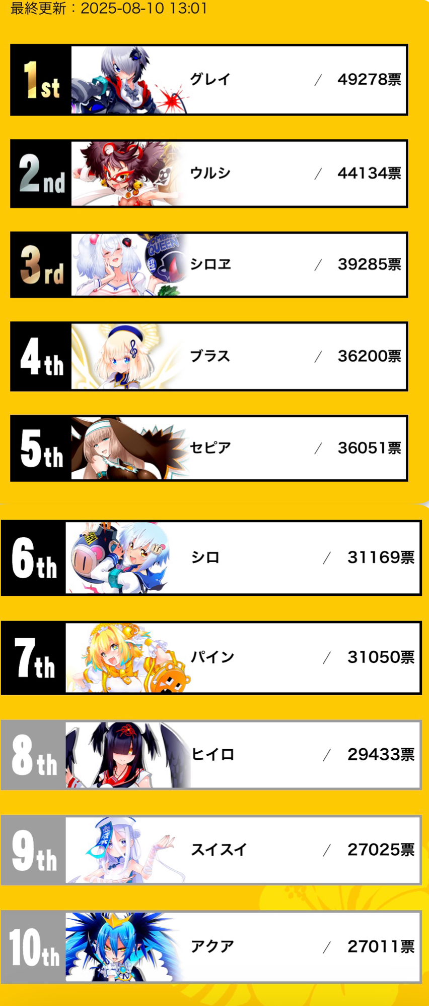 | … | 4025/08/10(日)13:27:20No.1341734117+グレイは灰柱がいなくても総合順位4位キープできる票数あるけど |
