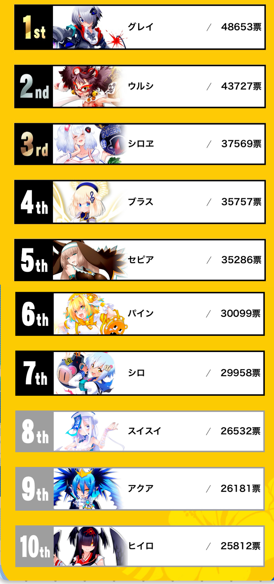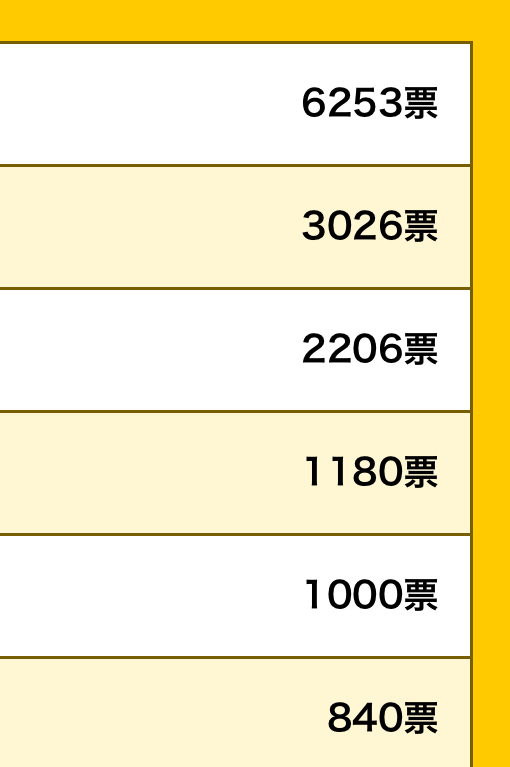 | … | 4925/08/10(日)13:32:17No.1341735546+>1位が4000票弱で4桁入れてるのも6人の割にはパインの票数が多すぎるんや |