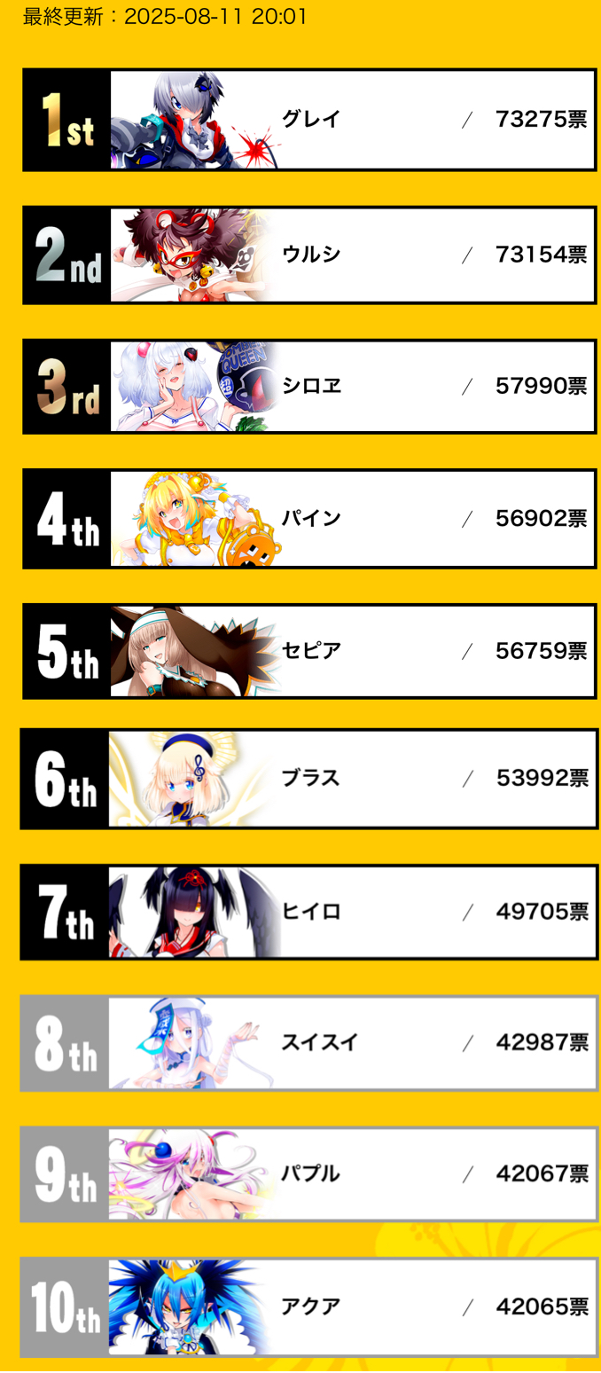| … | 325/08/11(月)20:28:17No.1342192807+ワテの投票でグレイが再び1位に返り咲いたな |
