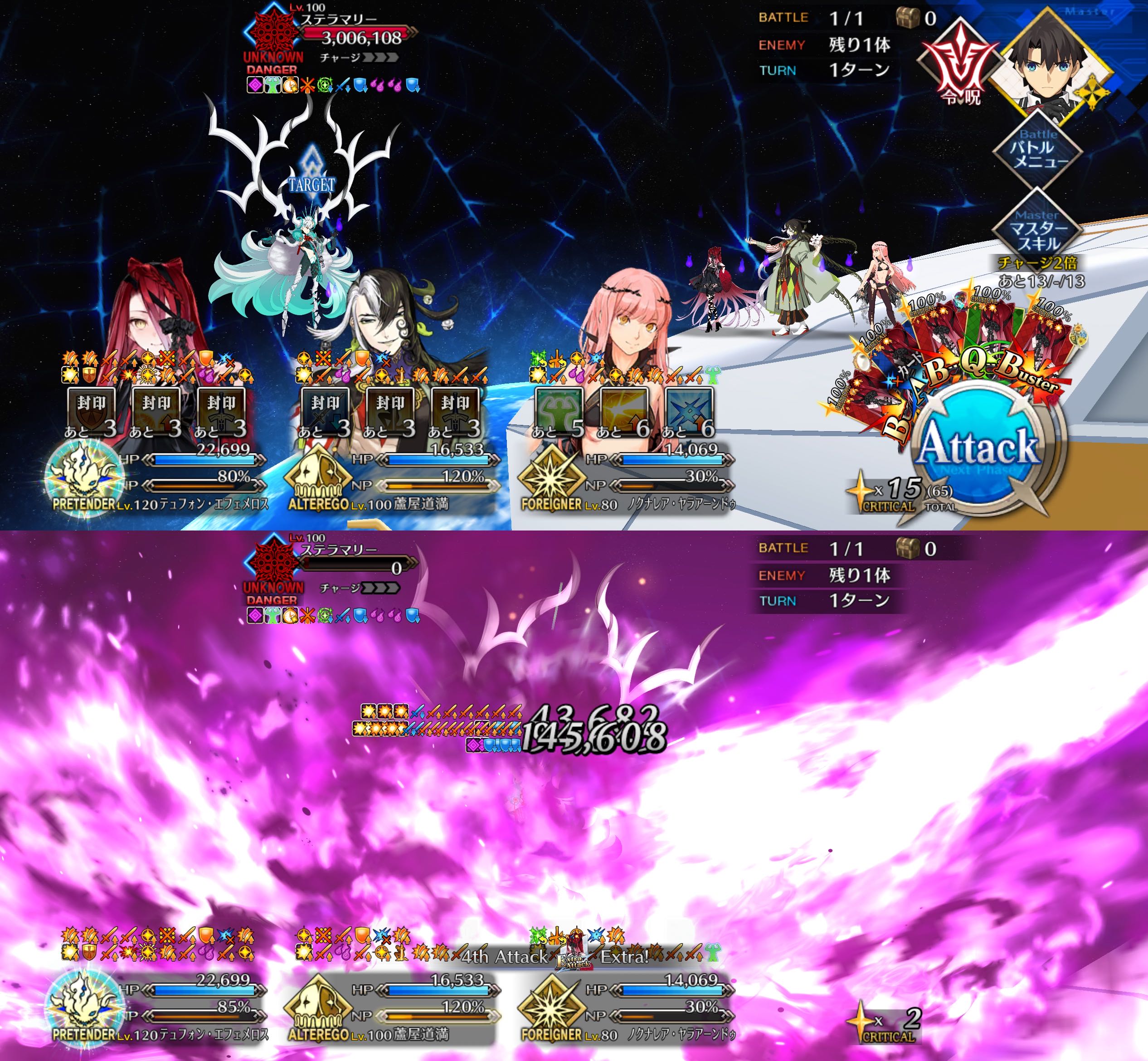 | … | 3325/08/12(火)13:28:31No.1342408884+>120宝具5にしてるからややカード運必要になるけど黒聖杯無しでステラマリー回れる |