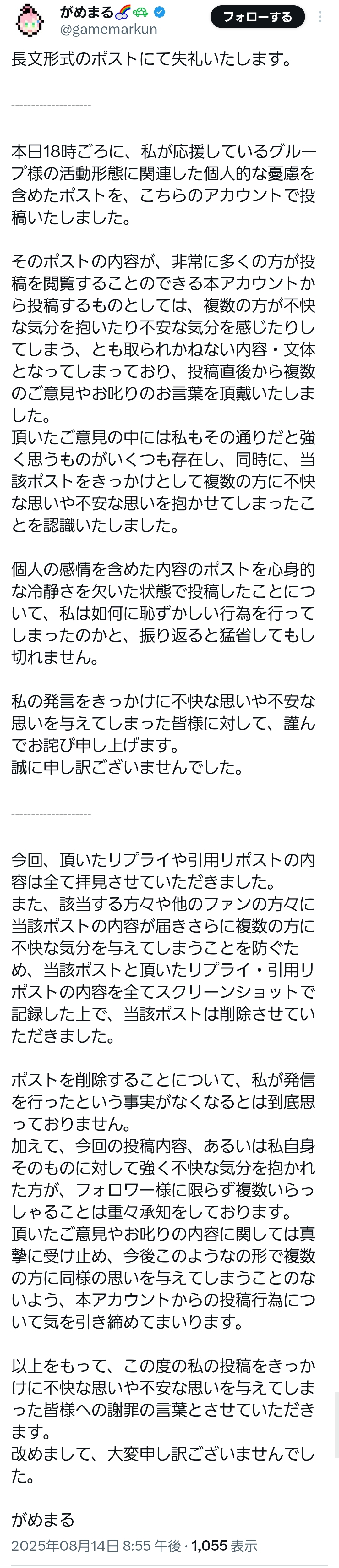 | … | 7625/08/14(木)21:01:55No.1343177866そうだねx18>当該ポストと頂いたリプライ・引用リポストの内容を全てスクリーンショットで記録した上で、当該ポストは削除させていただきました。 |
