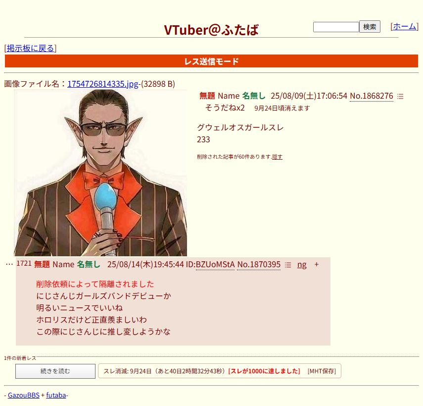 | … | 40725/08/14(木)21:36:38No.1343193764+書き込みをした人によって削除されました |